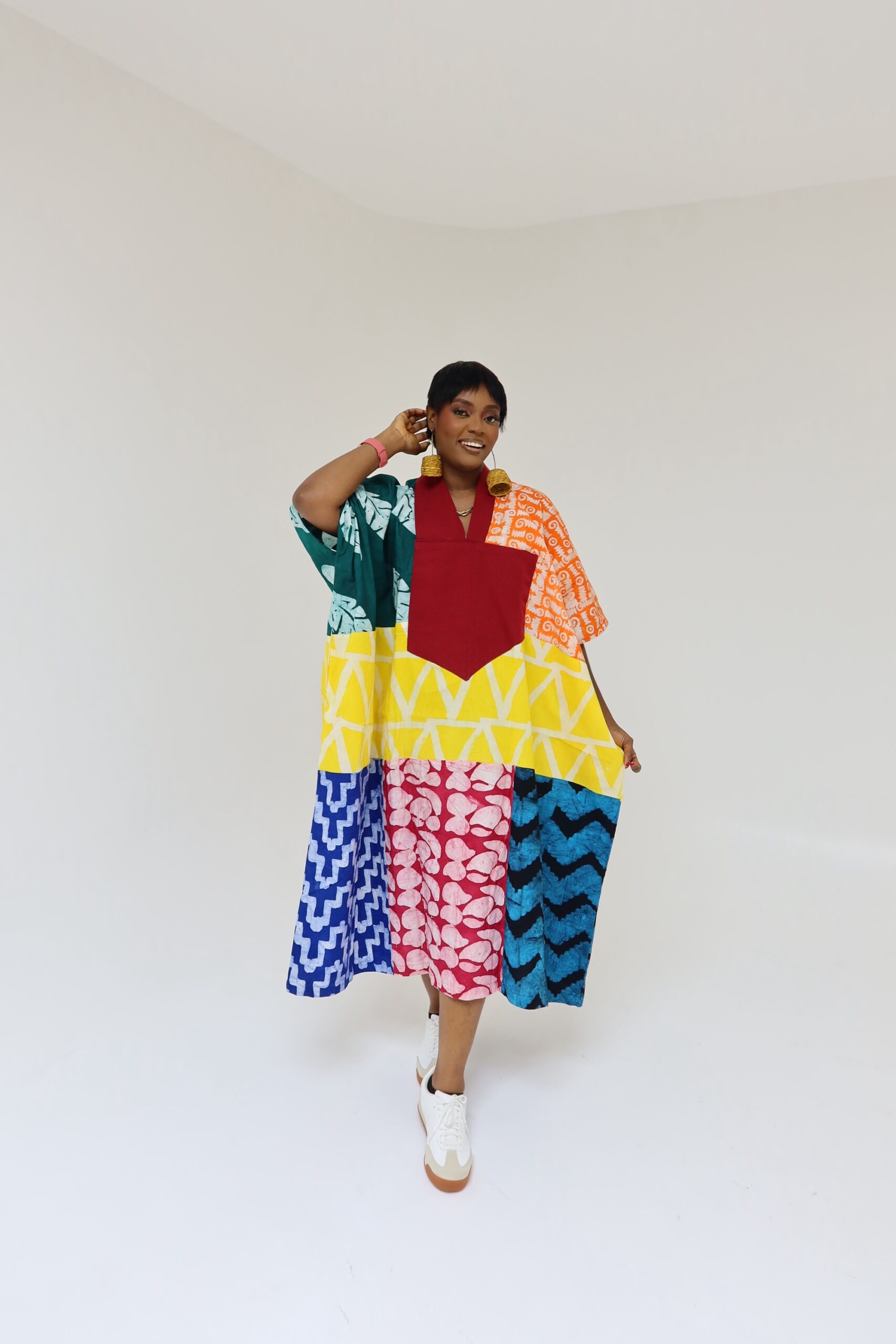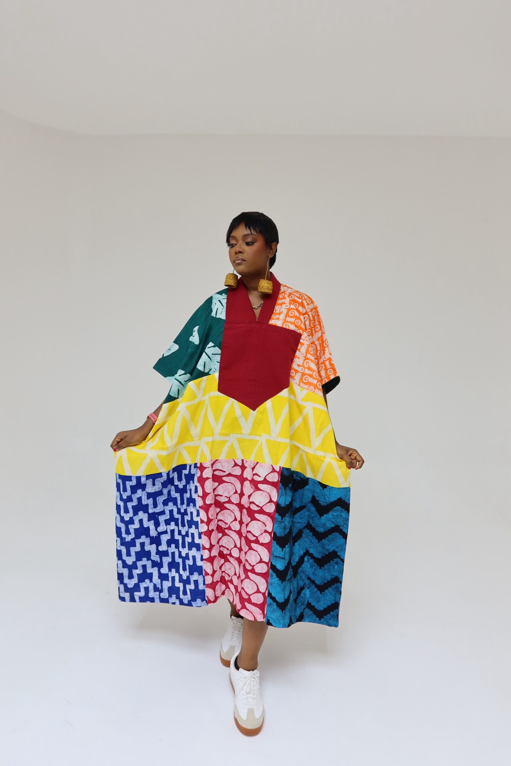 These are largely oversized fits, made from %100 cotton fabric, they’re 3/4 lengths and you can select yours from the length options, the standard is 52inches on the model, model height is 5’9