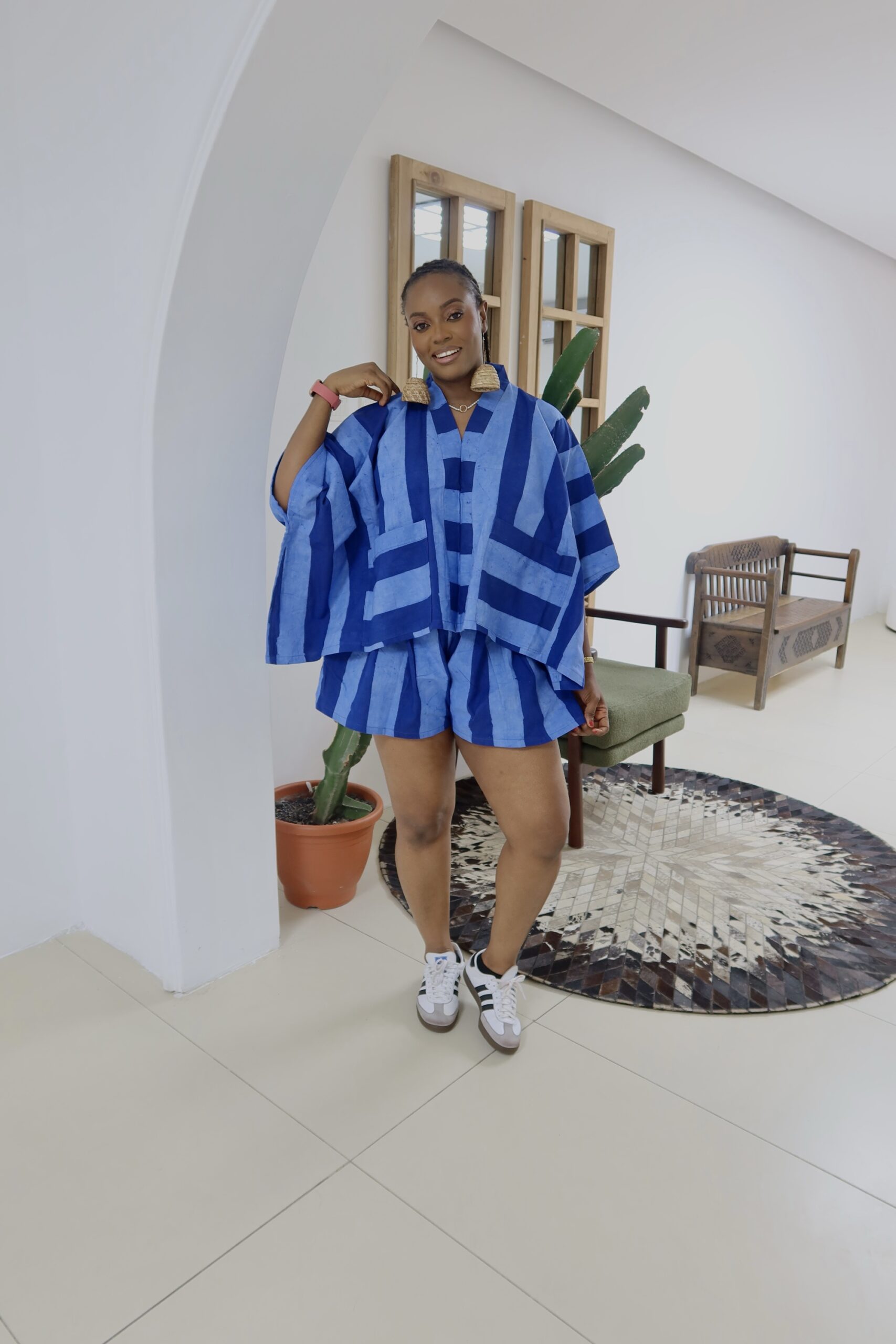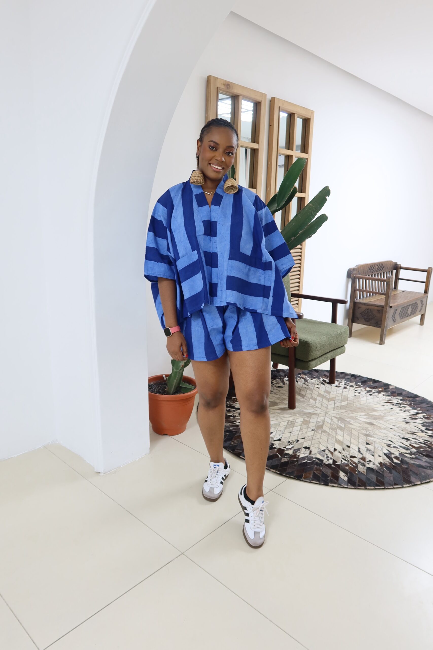 This is a largely oversized outfit, the top is made like an agbada , the shorts are made baggy and oversized with the option of choosing your preferred waist size