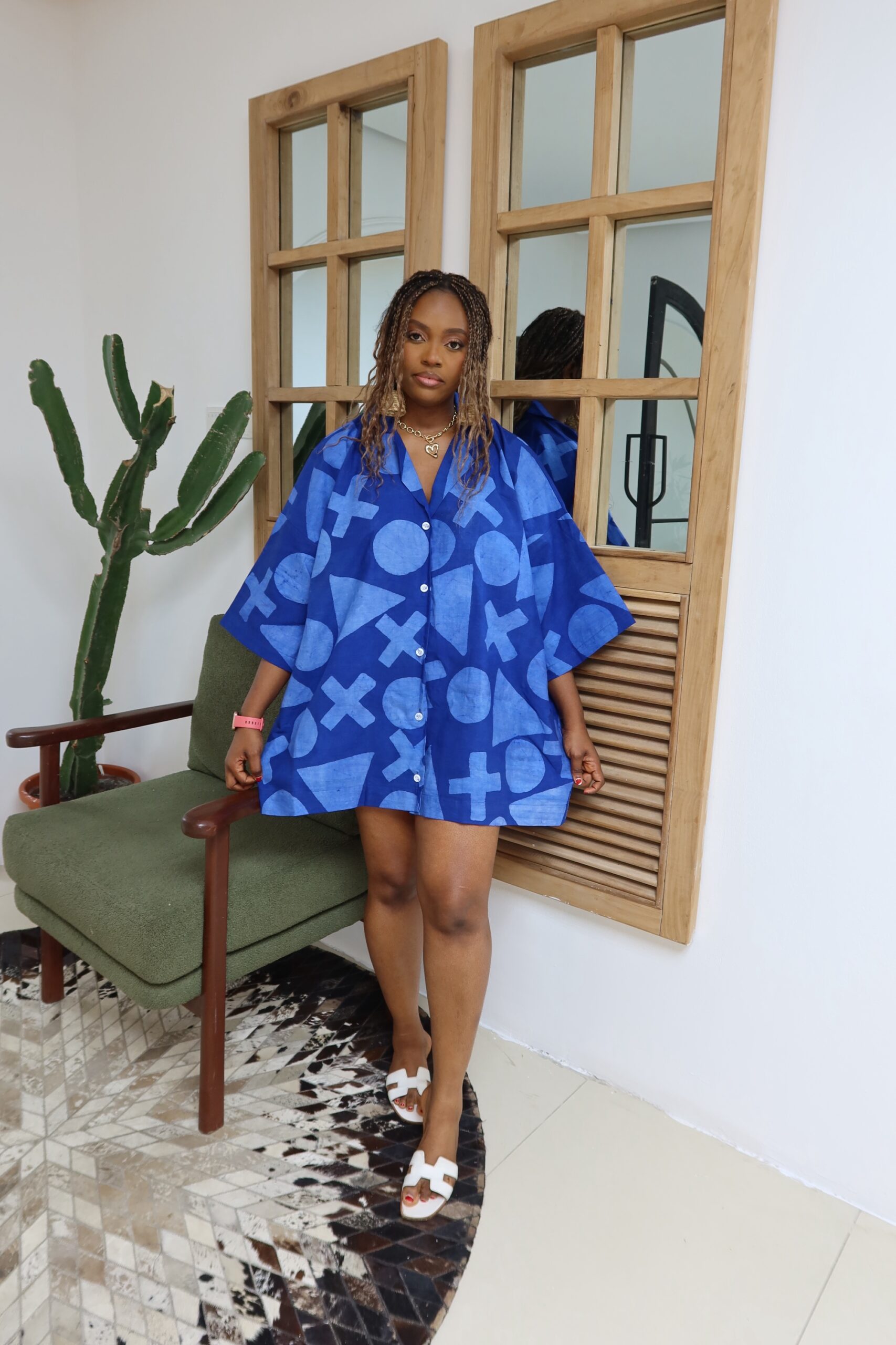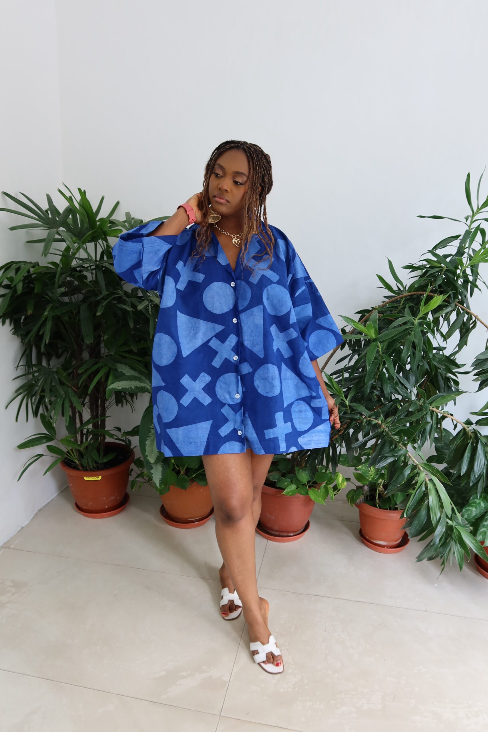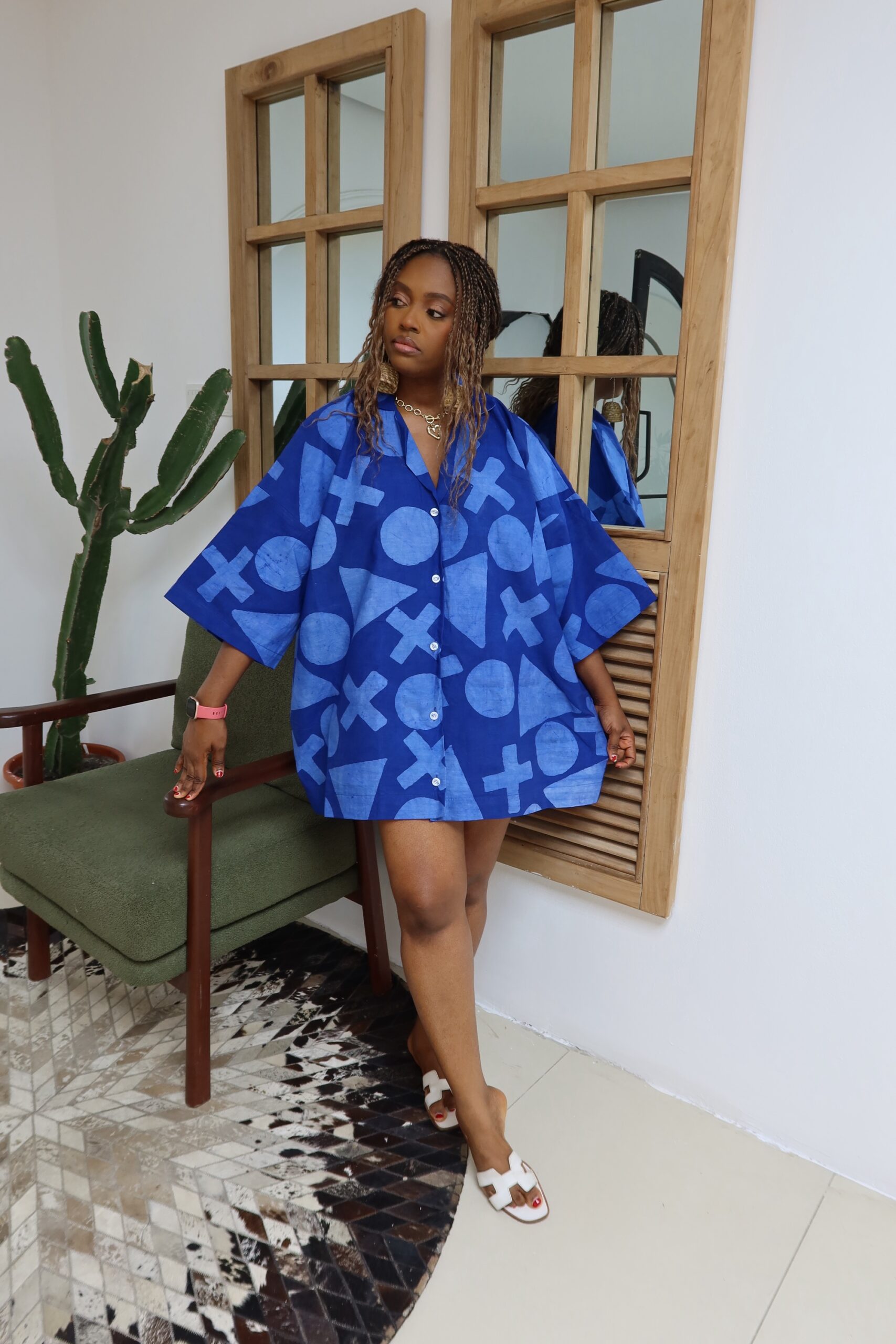 This is an oversized shirt dress , fit is one size fits all, it comes in 3 lengths, 33,34 and 35inches, the length on the model is 33inches